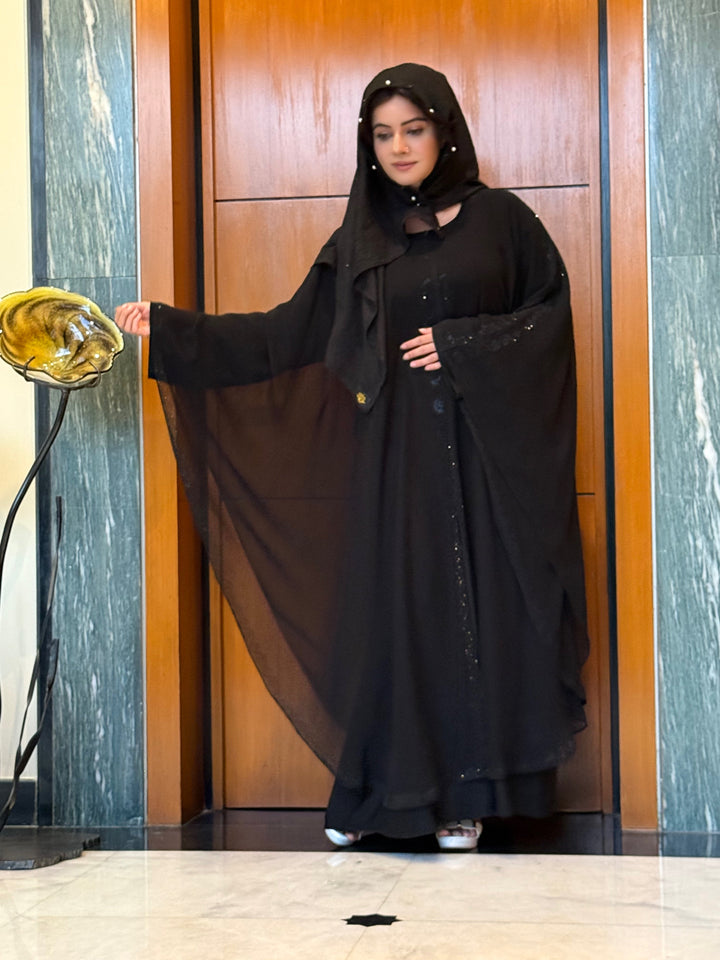 Adorned with sparkling DMC stone work along the front panel and sleeves, this abaya creates a luxurious look ideal for formal events, religious gatherings, or evening wear. The wide flare design enhances its graceful silhouette, making it a standout piece in your modest wardrobe.