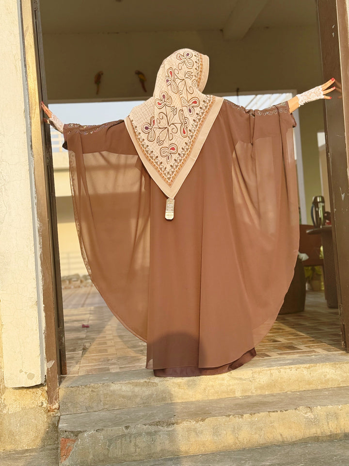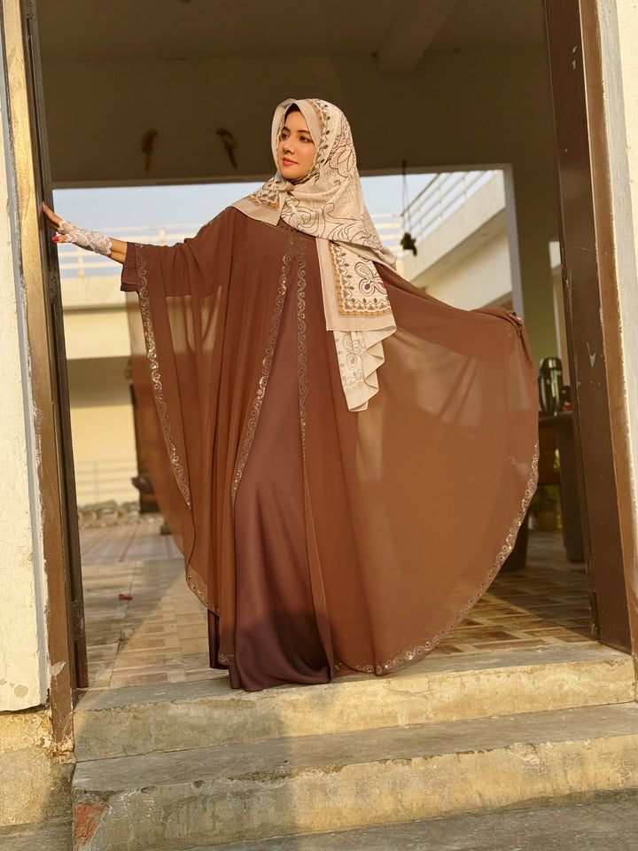 The flowing kaftan silhouette, made with a lightweight chiffon overlay and a soft inner lining, offers regal movement and modest comfort. Perfect for weddings, festive occasions, or formal evenings, this piece is designed to captivate while keeping modesty at the core.