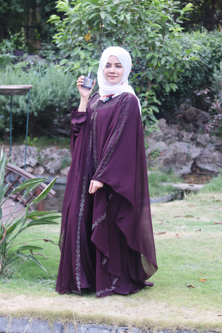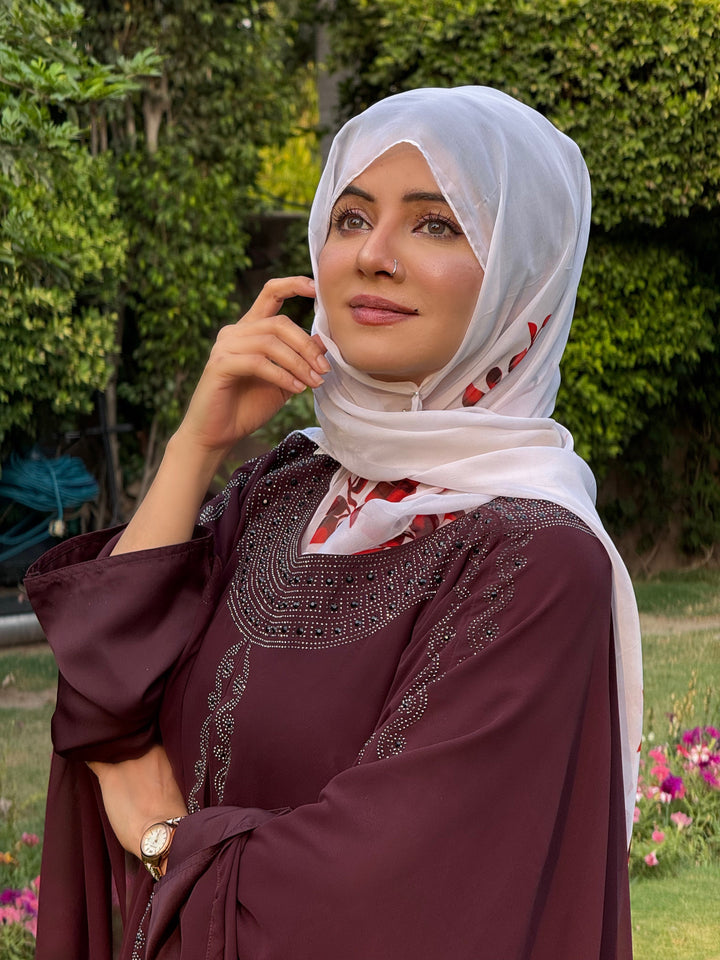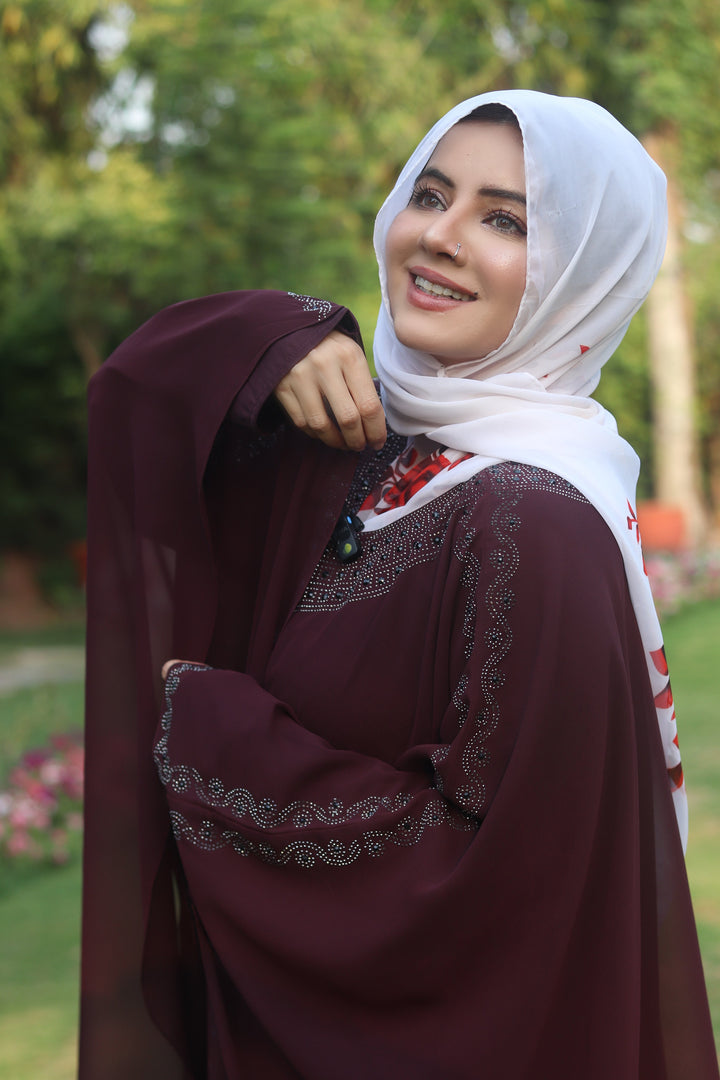 Make a bold and beautiful impression with our Luxury Maroon Kaftan Abaya — a signature design by Haya by Rabi that blends elegance with intricate craftsmanship. This stunning abaya features hand-applied white DMC stone work and delicate black bead embellishments, adding shimmer and depth to the neckline, front opening, and wide butterfly sleeves.
