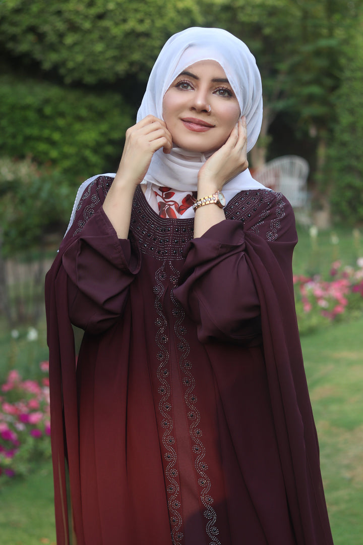 Luxury Maroon Kaftan Abaya with DMC Stone Work – Formal Glamour by Haya by Rabi